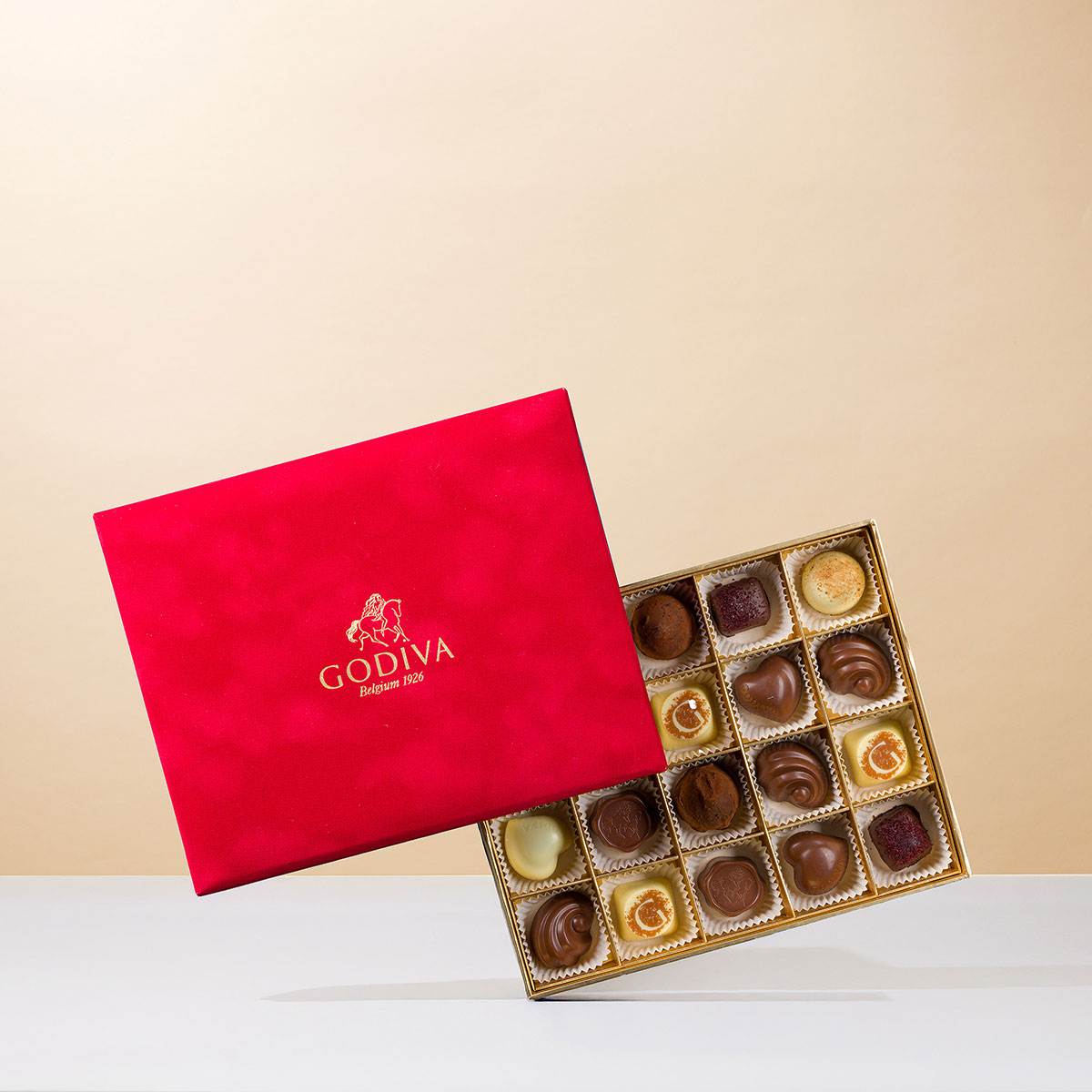 Cette boîte en velours rouge est remplie d'une sélection de diverses pralines en chocolat Godiva aux fourrages délicieux. Une véritable surprise pour les amateurs de chocolat. Cette boîte cadeau élégante est le cadeau idéal pour une célébration ou pour remercier quelqu'un avec le meilleur chocolat de Belgique.