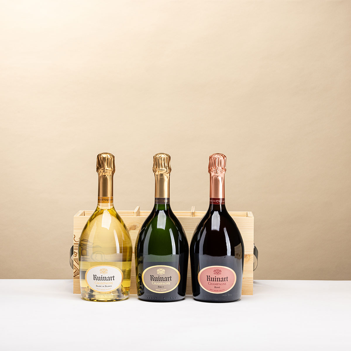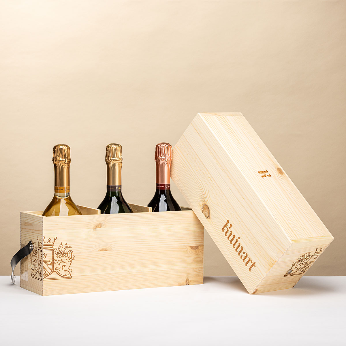 Découvrez toute la richesse du style Ruinart avec le R’ de Ruinart, Blanc de Blancs & Rosé en Coffret Bois. Ce coffret prestigieux réunit la trilogie Brut emblématique de la Maison : le “R” de Ruinart, le Blanc de Blancs et le Rosé. Une présentation élégante qui met en valeur le savoir-faire, la finesse et l’héritage du plus ancien Champagne.