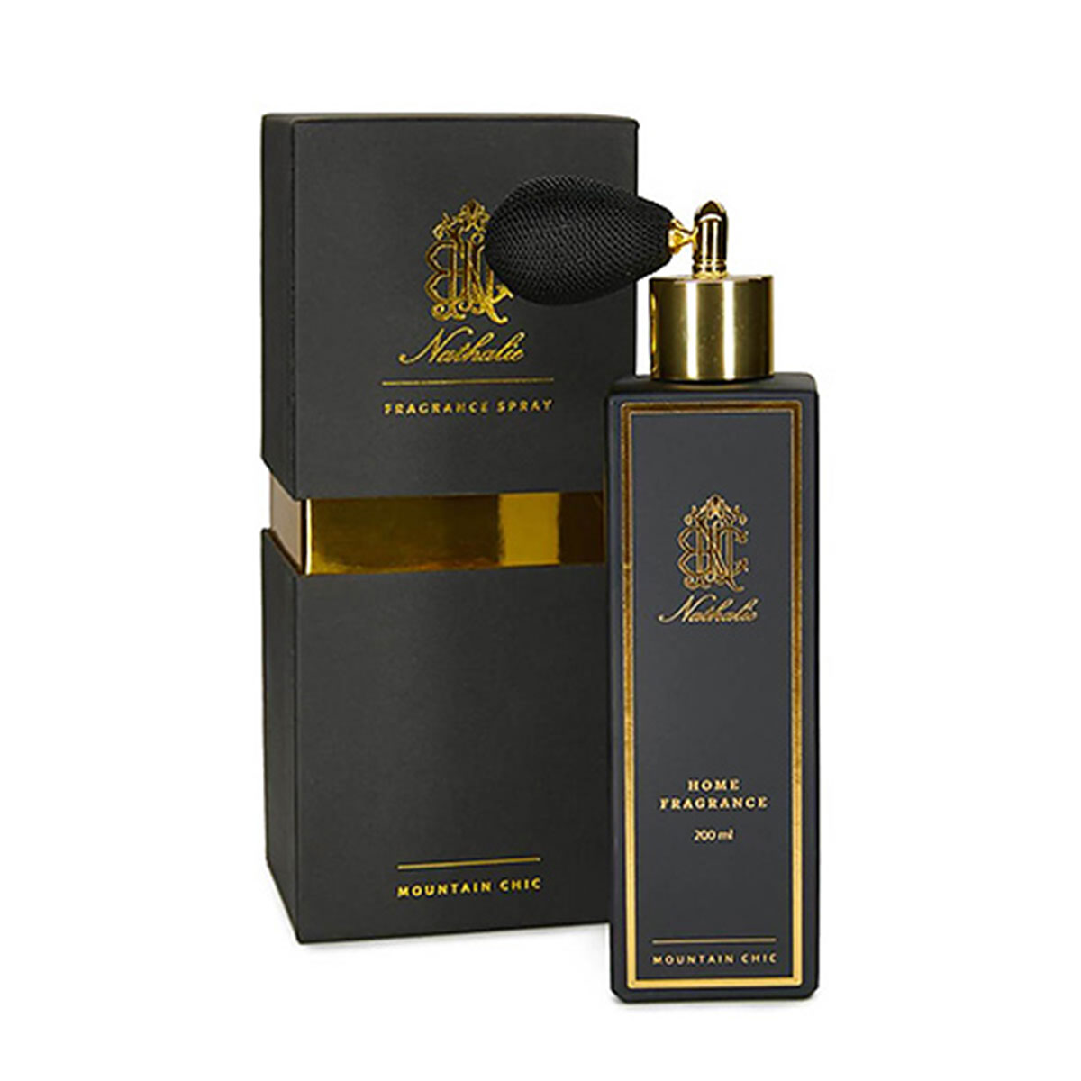 Enter into an enchanting experience with Le Parfum de Nathalie's luxury Mountain Chic home fragrance, an exclusive lush scent with soft notes of sandalwood and velvet leather with an enchanting floral heart. This Nathalie gift set features a small luxury scented candle, a vial of home fragrance spray, and small body care products.