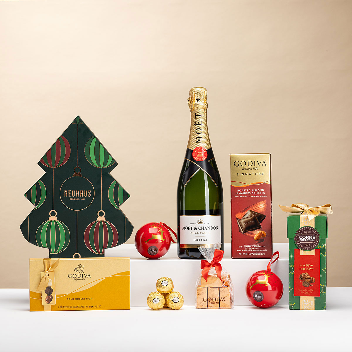 Haz que las fiestas sean inolvidables con el Christmas Chocoholic Deluxe, una combinación elegante de Champagne Moët & Chandon y una selección de chocolates de Navidad de la más alta calidad. El Moët Impérial Brut destaca por su elegancia, notas frutales brillantes y un paladar suave y armonioso.
