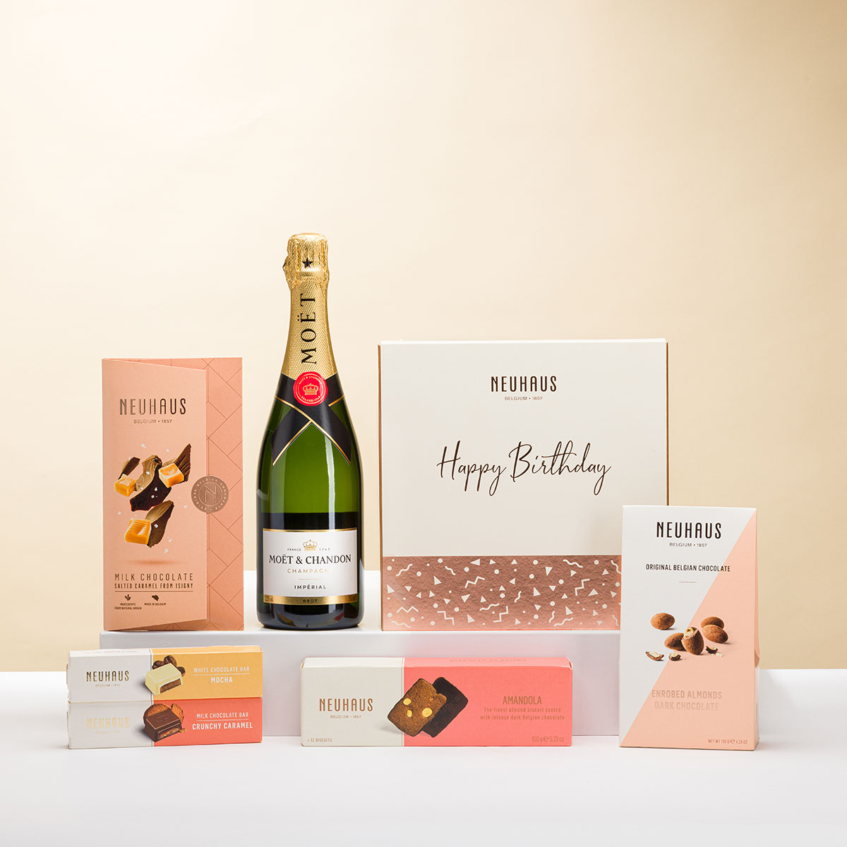 Transformez ce jour en un joyeux anniversaire avec une magnifique collection de chocolats belges de Neuhaus, accompagnée du champagne Moët & Chandon. C'est la façon idéale de souhaiter un joyeux anniversaire à vos amis et à votre famille.