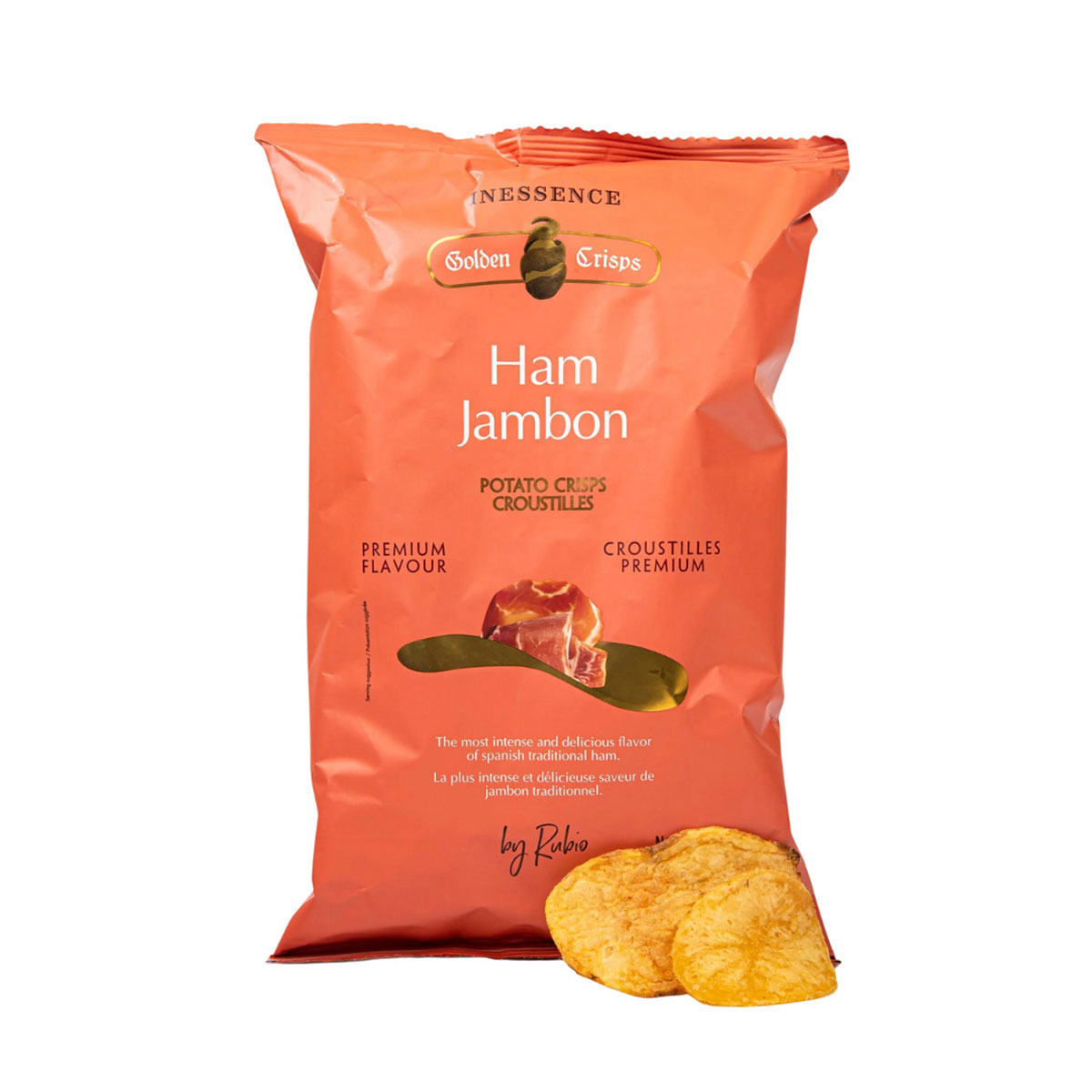 Potatoes, sunflower oil, olive oil and ham flavoring [maltodextrin, salt, flavouring, yeast extract, flavor enhancer (monosodium glutamate 7.92%, disodium 5′-ribonucleotides 0.4%), smoke flavoring].
