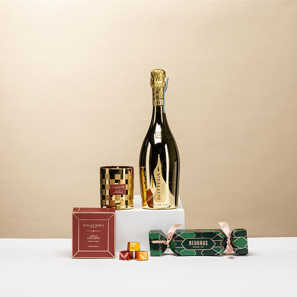 Feiern Sie Weihnachten mit diesem exklusiven Geschenk-Trio aus Bottega Gold Prosecco Spumante, Neuhaus Weihnachtspralinen und einer luxuriösen Atelier Rebul Apfel-Zimt-Duftkerze in Sonderedition.