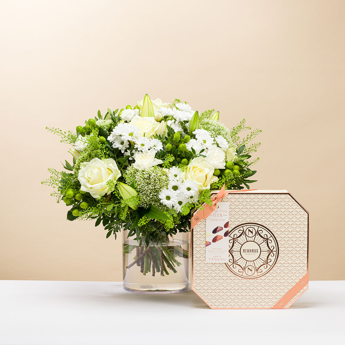Die Kombination unseres Simply White Straußes mit der neuen Neuhaus Icon Collection ist ein elegantes Geschenk für jeden Anlass.