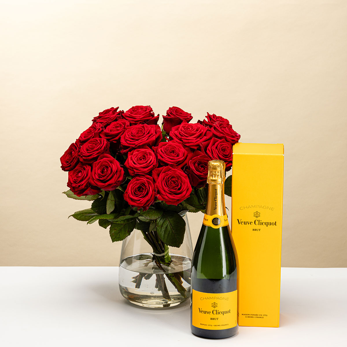 Roses rouges et champagne Veuve Clicquot envoyé aux Pays-Bas